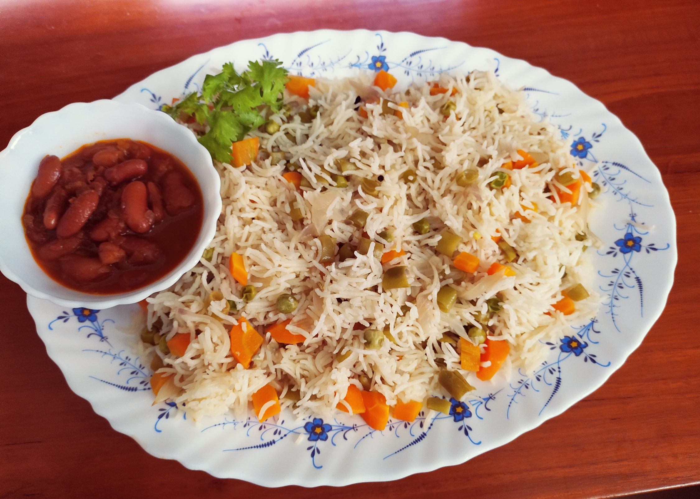 We can serve Vegetable Pulao with Rajma Masala, Gobi Manchurian and Curry of your choice. You can add Vegetables ( cauliflower, mushroom,carrot,beans,Frozen peas, potato) based in your choice.
